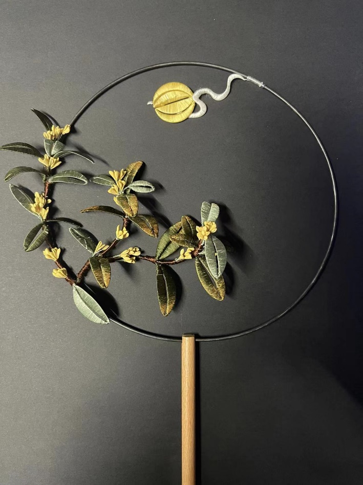 《一半春》采用缠花的技法,整体淡雅、古典。桂花与月季,一个属春,一个属秋,对于万花竞美的文学意味上的“春天”,便已是占了一半,也吻合了套装中有一部分来自春天花朵的表意。作为一套首饰,其中包括了三个发簪和一个软簪,其中三个发簪又自成一套,由桂花和叶子组成,不同颜色的叶子增加了其丰富度,又以铜珠做点缀,增加层次感。软簪作为束发的配饰则为这套首饰更添亮点,色彩在统一的基础上也得以更加丰富,展现出别样的古典美。