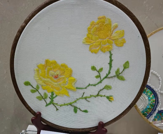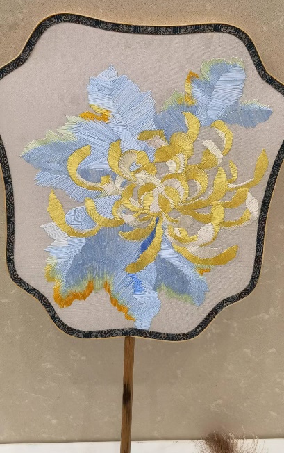 采菊东篱下,悠然见南山。菊之品格,高风亮节,自古被誉为“花中隐士”。运用苏绣的技法绣了两枝傲然开放的菊花。