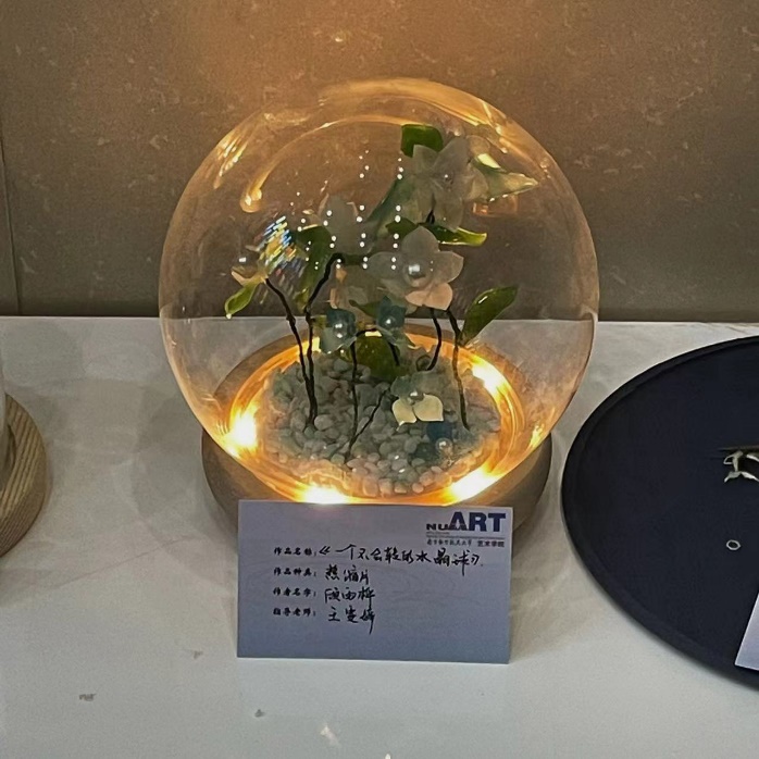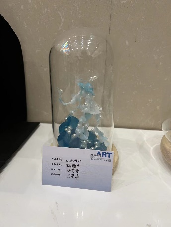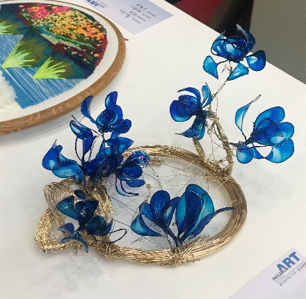 造花液摆件,《海》使用铜丝和蓝色造花液以及珠饰,造出环形网状物,蓝色花朵从中长出,在光线照射下蓝色光影投在台面上如同微观海洋。