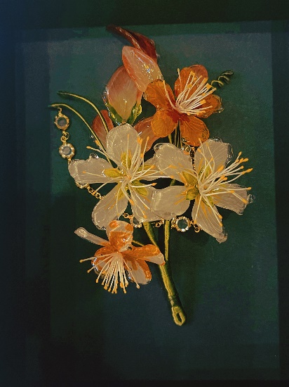 《烟里》。本作品是热缩片花朵,用胶水做出露水的样子,突出花瓣的娇嫩,配色均采用较亮的颜色,越到尖端颜色越浅,表现出雾中花朵朦胧的质感