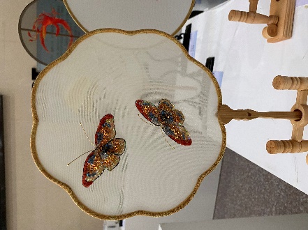 蝴蝶胸针,珠绣和刺绣相结合,来表现蝴蝶翅膀上不同花纹效果。穿花蛱蝶深深见,点水蜻蜓款款飞。