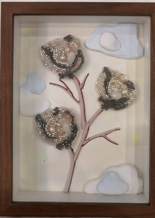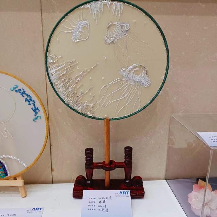 第二幅《星河碎梦》是海底梦幻世界,采取珠绣形式,展现的事蓝色的海洋世界,以轻盈飘逸的水母为主体,多色蓝色渐变在底部模仿海浪的的环境,以片状贝壳点缀。