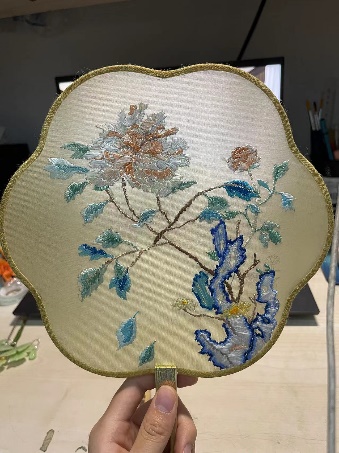 满园春 这个作品运用低饱和度的颜色来绣,一朵牡丹冲破石缝而生长。叶子随风而落也更为刺绣增添生动的气息。