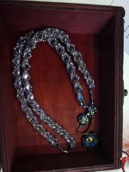 我多用白色和蓝色珠子,整体色调为蓝白色,再以金色为辅色,所以整体色彩搭配比较清新,图案以圆形为主题,整体形成对称感。