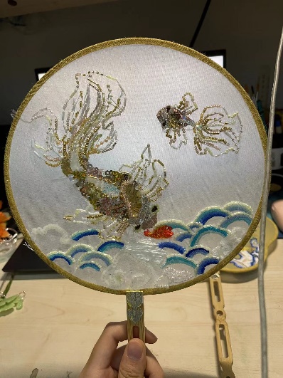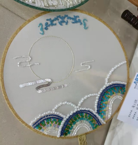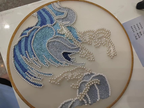 浪·锦鲤 这个作品是珠绣和刺绣的结合 大海的层次分明又附着在云朵上,两条锦鲤仿佛是在跃龙门,用亮片绣鱼身又好像鳞片一样,锦鲤更加迎来好运。