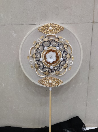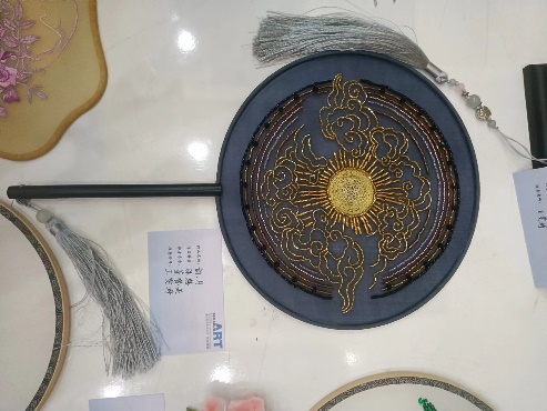 金黄色的满月发出耀眼的光辉,这光芒穿透云层,一圈又一圈的光晕由亮到暗,直至消亡。黑色扇面搭配金色米珠,金光灿灿,让人产生无限联想。祥云的图案结合的中国古画中的纹样,整个图案有“守得云开见月明”的美好寓意。