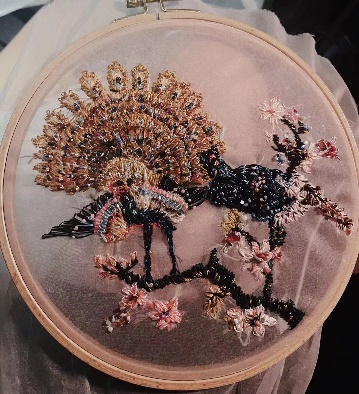 《赫拉之春》。由孔雀、花朵、树干组成,孔雀在希腊神话中代表天后赫拉,本作品着重用丝线渐变和米珠突出孔雀羽毛和尾屏的质感,体现出孔雀的高贵骄矜而美丽,复古配色是为了更加贴近神话氛围