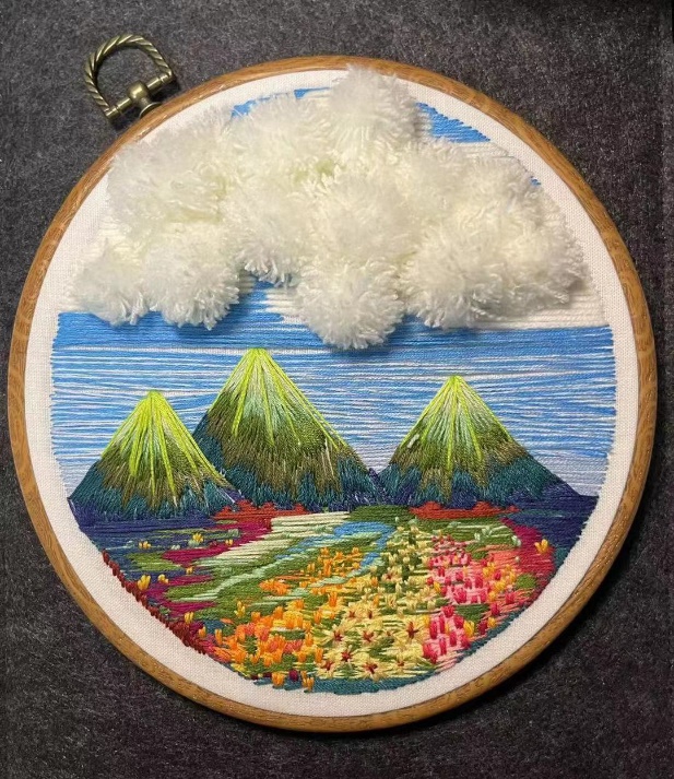 这个作品主要是用黑色为底来衬托花的鲜艳,花是用打籽针法绣成的,一朵朵鲜艳的花朵向远处蔓延,直至消失在云端,与黑夜融为一体,灰蒙蒙的天空与鲜艳的花朵作出对比,使得花朵更加引人瞩目