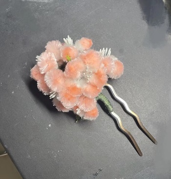 绒花发簪,用蚕丝和铜丝为工具做的枝头桃花盛开的样式。