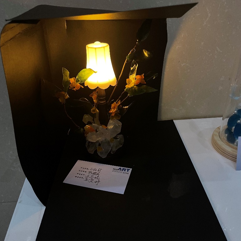 以台灯作为主体物,用热缩片做成的花朵做点缀,小花在灯光的照射下显得更加晶莹剔透。这个台灯的灯光是暖黄色的,搭配着比较暗调的花朵,在灯光的照耀下,台风上的枝干、花朵、绿叶甚至是盆底的基石都非常闪烁。