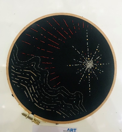 珠绣,《星夜》,发散状排列彩珠,红蓝撞色搭配金白表现浓郁夜空璀璨星光。
