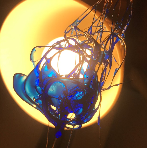 造花液挂件,《幻象》,通过铜丝密集交错组织结合通透蓝色斑块,可以在灯光下投射出奇异光景。