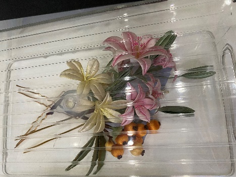 由白色透明的造花液制作而成的花朵,花瓣上加以银箔点缀
