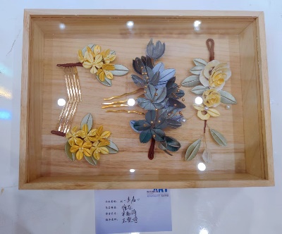 这套作品用缠花的形式缠出了两对头饰,主要是用蚕丝线慢慢的缠绕在叶子和花朵的模型之上,经历了千辛万苦终于使得每一朵花瓣和叶子平整丝滑,这两对头饰采用了粉色和黄色,使得它艳丽而不庸俗,让人一眼就能看得见