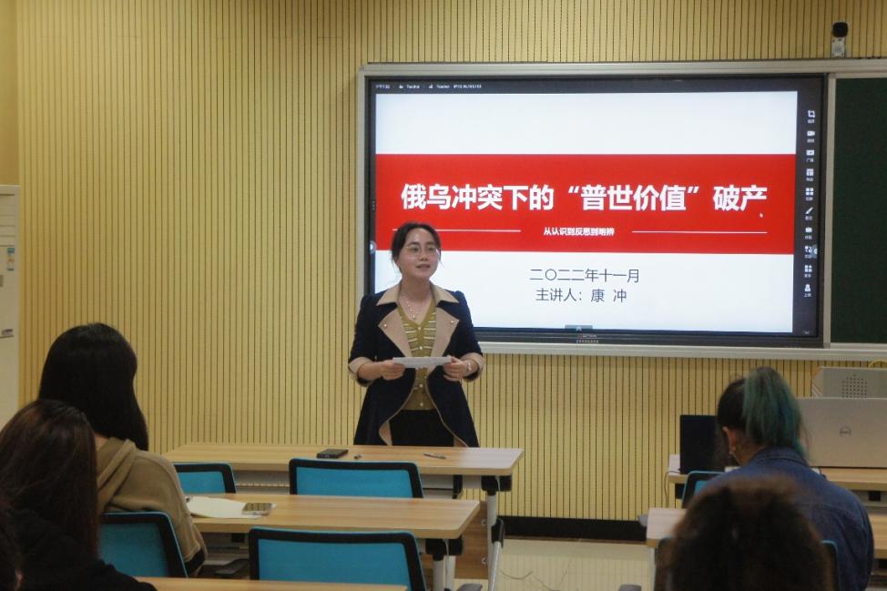讲座中,康冲老师围绕时下最热点的国际事件“俄乌冲突”展开,分析了俄乌冲突的历史经纬,揭露了西方普世价值的实质,是西方的特权、例外权、优先权和霸权,在对比中,让同学们清晰的认识到,社会主义核心价值观是全人类共同价值的具体表现形式,中国特色社会主义是实现中华民族伟大复兴的必由之路。引导青年群体树立正确的历史观、世界观、人生观、价值观。