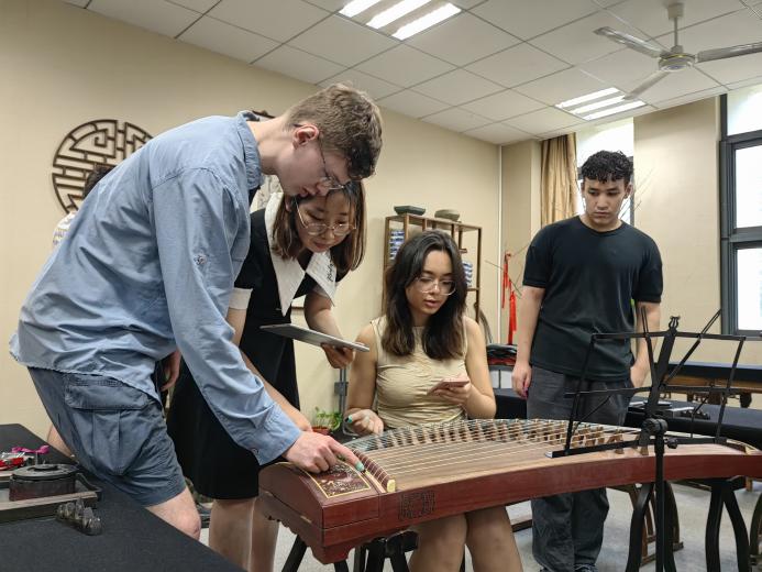古筝与古琴的教室里,悠扬的琴音袅袅传出。老师先为留学生们讲述了乐器的历史渊源,随后指导他们如何拨弦按音。留学生们轻抚琴弦,沉浸在古典音乐的美妙世界里,感受着中国传统音乐时而激昂奔放、时而婉转低回的灵动与深沉。