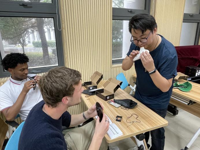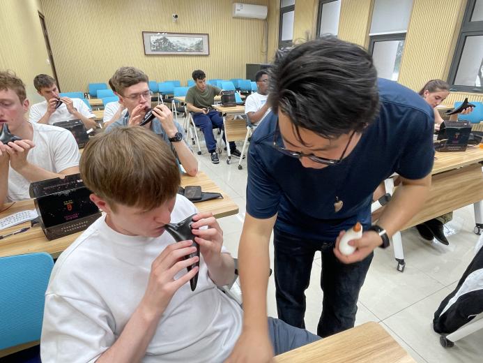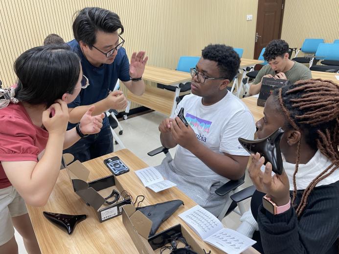陶笛课充满了欢快的氛围,老师先介绍陶笛的构造和发音原理,留学生们用手中的陶笛吹奏出动人的旋律,让欢快的音符在空气中跳跃,感受这一乐器的独特魅力。