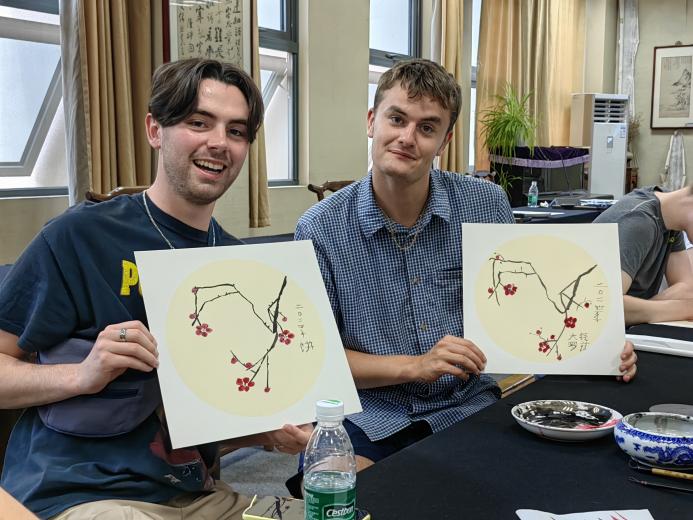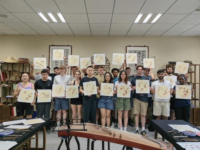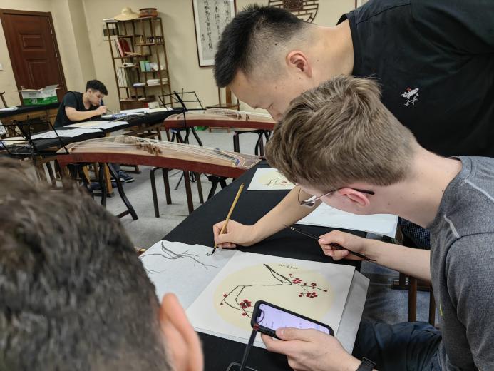 “倚东风,一笑嫣然,转盼万花羞落”,国画课上,留学生们在老师的悉心指导下用手中的画笔轻蘸颜料,描绘出梅花的神韵,从线条勾勒到色彩渲染,逐步领悟中国传统绘画中“以形写神”的独特韵味。