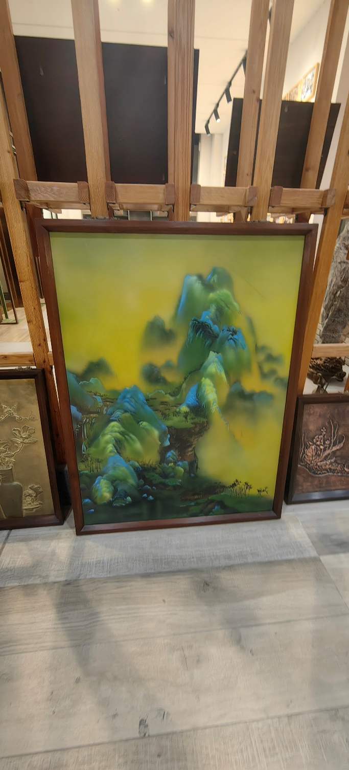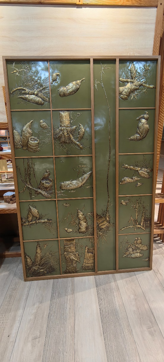 我们踏上三楼,各种铜艺作品散落在木质展柜上,我一眼注意到其排列,谈不上紧凑,但也不像博物馆一样由一个个玻璃柜仔细分割并呈设,而是处于一种恰到好处的松弛而又丰富的状态。正如讲解员所说:“这里的很多作品是雅俗共赏的。”漫步其中,我发现有很多铜艺作品的题材贴近当时、当地百姓的生活,如稻田里的毛蟹、黄豆丛、茂密的竹林等,有的色调单纯,有的则着色大胆鲜艳。尤其是在几件比较抽象的艺术作品中,非深入体会则不见其精妙。“雅俗共赏”一词看似包含两个相互对立的成分,像是油与水不相交融,但真正见到这样的艺术作品时,我才意识到,艺术之美不是简单的非黑即白的,更像是水乳交融,而圆融之美正藏在这一幅幅铜画中。在薄薄的铜板上做出凹凸不平的,栩栩如生的橙色金鱼,形状各异的竹笋。每一件作品都蕴含着无比精妙的技艺,而大部分题材又贴近人们的日常生活,即使是一位没有受过系统艺术训练的人也可以从其趣味性和精致地构图上体验到奇巧之处。