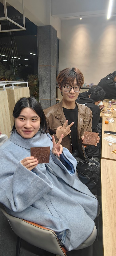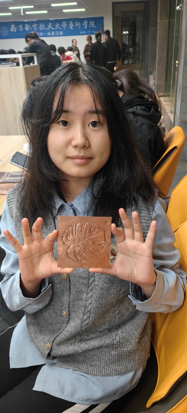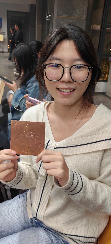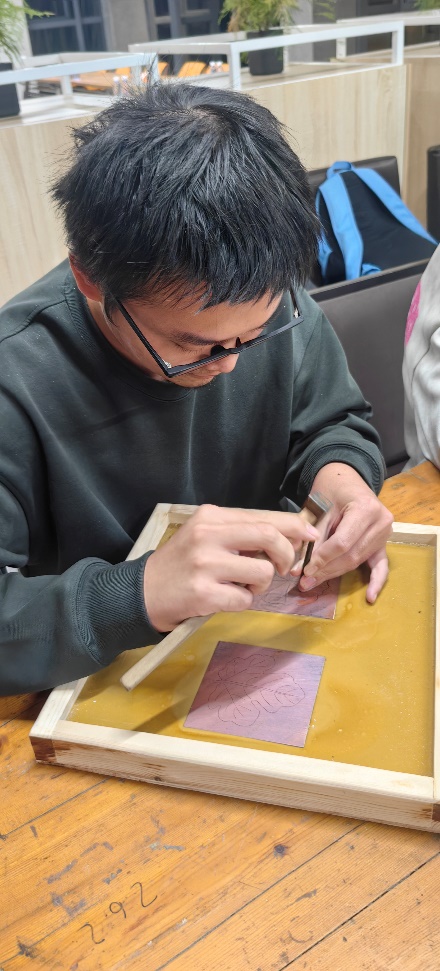 在参观完展品后,最让人兴奋的环节是亲手实践。若说观摩是跨时空的交流,那么动手制作一幅铜版雕画则是对于技艺实实在在的磨练了。我们的任务是对一张已经画好图案的小铜片进行敲打和雕琢,使其轮廓逐渐呈现凹凸的效果。一走入这间工作室,同学们制作铜艺作品的敲打声响成一片,极似雨打芭蕉声,那是先行实践小组的同学们正在聚精会神地精耕着自己的作品。回头一看,我们的老师也在拿着小锤子正在敲打着,心想,等会得跟他一比高下,看看谁的作品更有创意。