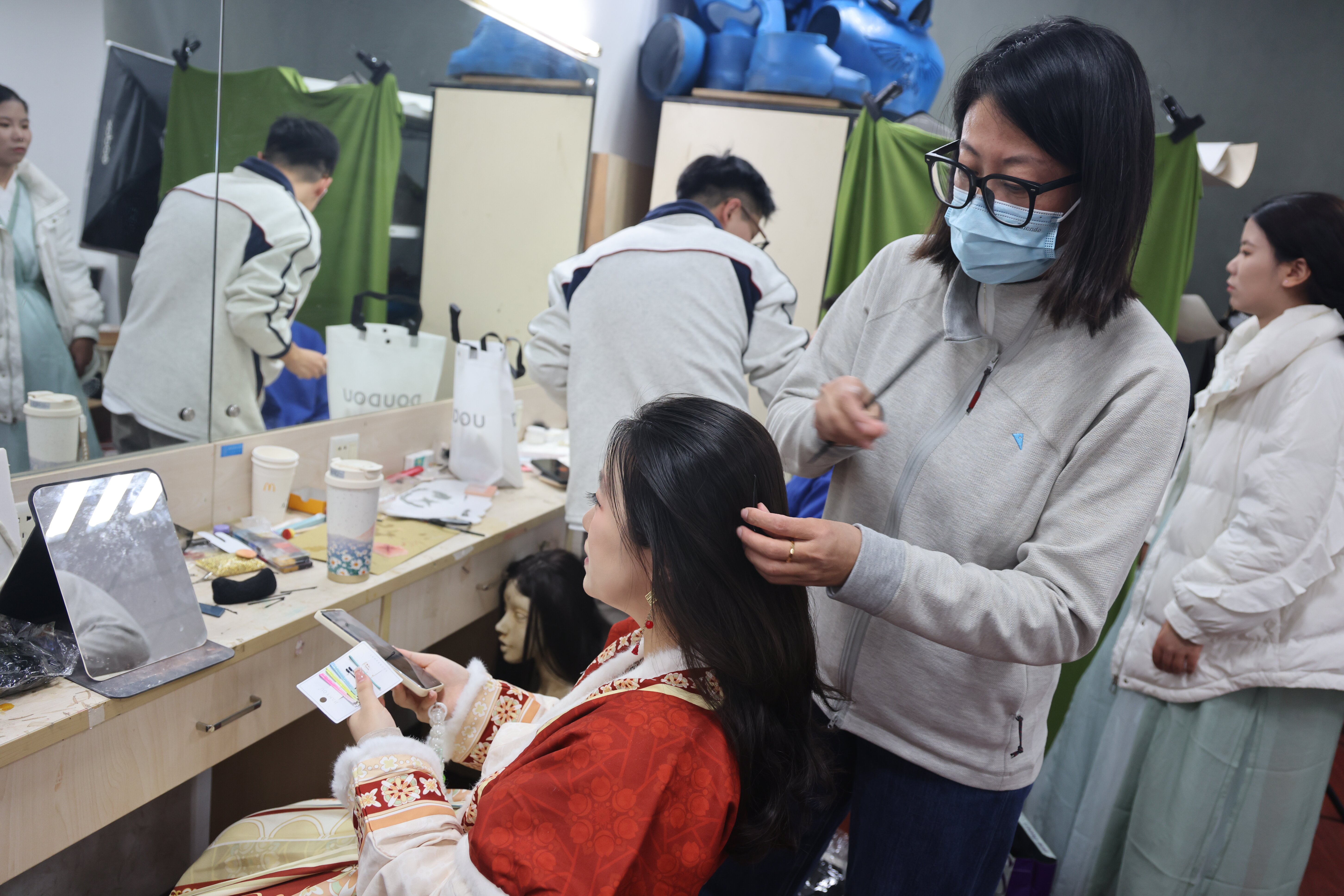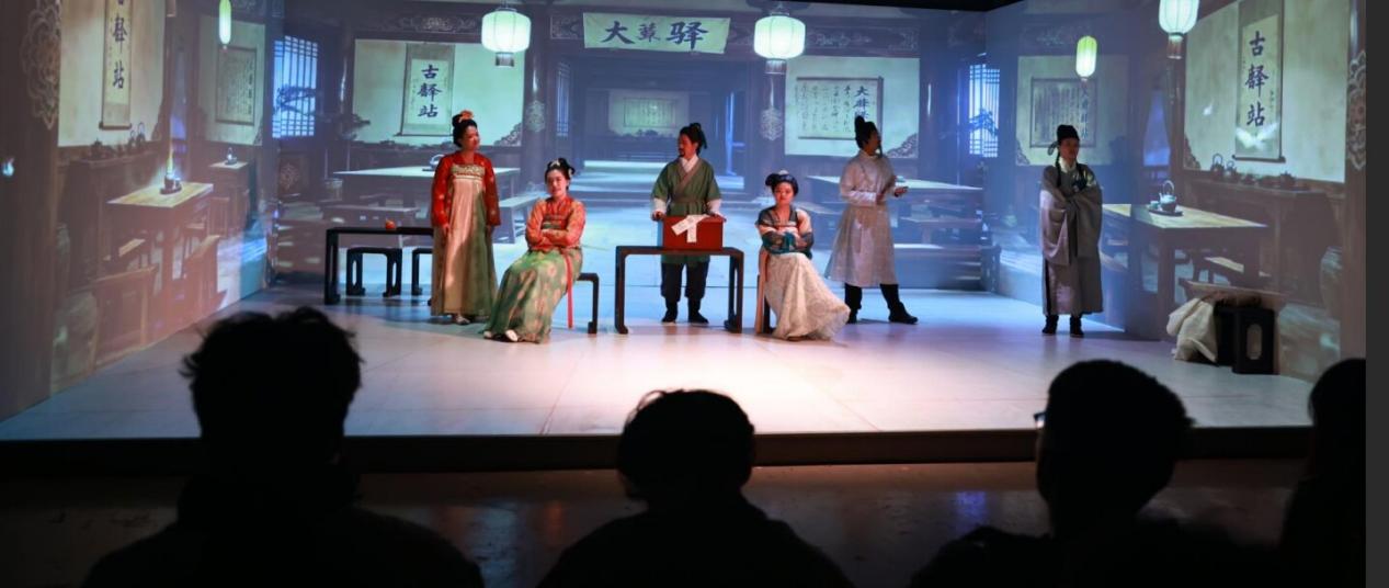 精彩的舞台效果离不开幕后的精心设计。自动化学院的王欣悦在参演《风雪摩家店》后深有体会:“这场沉浸式演出的温度,从不是某个人的高光,而是所有部门同频共振的结果。”从契合唐风的精细妆造,到精准烘托剧情氛围的灯光与沉浸式布景,美术系同学们的专业实践,为理工科演员们的真情演绎提供了坚实而绚丽的支撑,共同营造出引人入胜的戏剧时空。