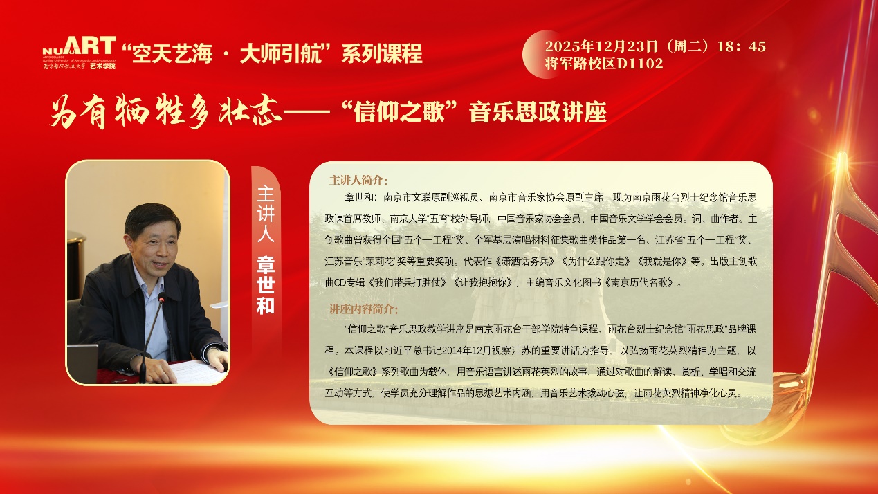 12月23日晚上,在我校D1102教室举办了“信仰之歌”音乐思政讲座。本次讲座邀请了南京市文联原副巡视员、市音乐家协会原副主席章世和老师担任主讲嘉宾,章老师以《为有牺牲多壮志》为题,为在场师生带来一场包含了历史回顾、理论讲座和歌曲学唱等内容的思政美育课。本次讲座由飞机杯自慰 板俊荣教授主持。