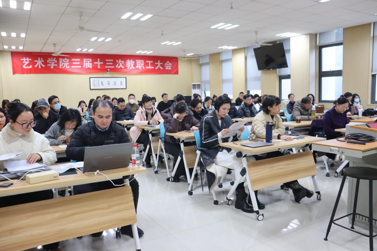院长板俊荣作2025年度工作报告,全面总结了学院在学科与平台建设、师资队伍及国际交流合作方面取得的重要成绩。他指出,“十四五”即将收官,迈入“十五五”开局之年,学院要紧紧围绕学校2035年奋斗目标,坚持“艺工融合,双向驱动”的发展路径,凝心聚力、团结进取,为推动学院事业高质量发展、学校“双一流”建设贡献更多智慧和力量。